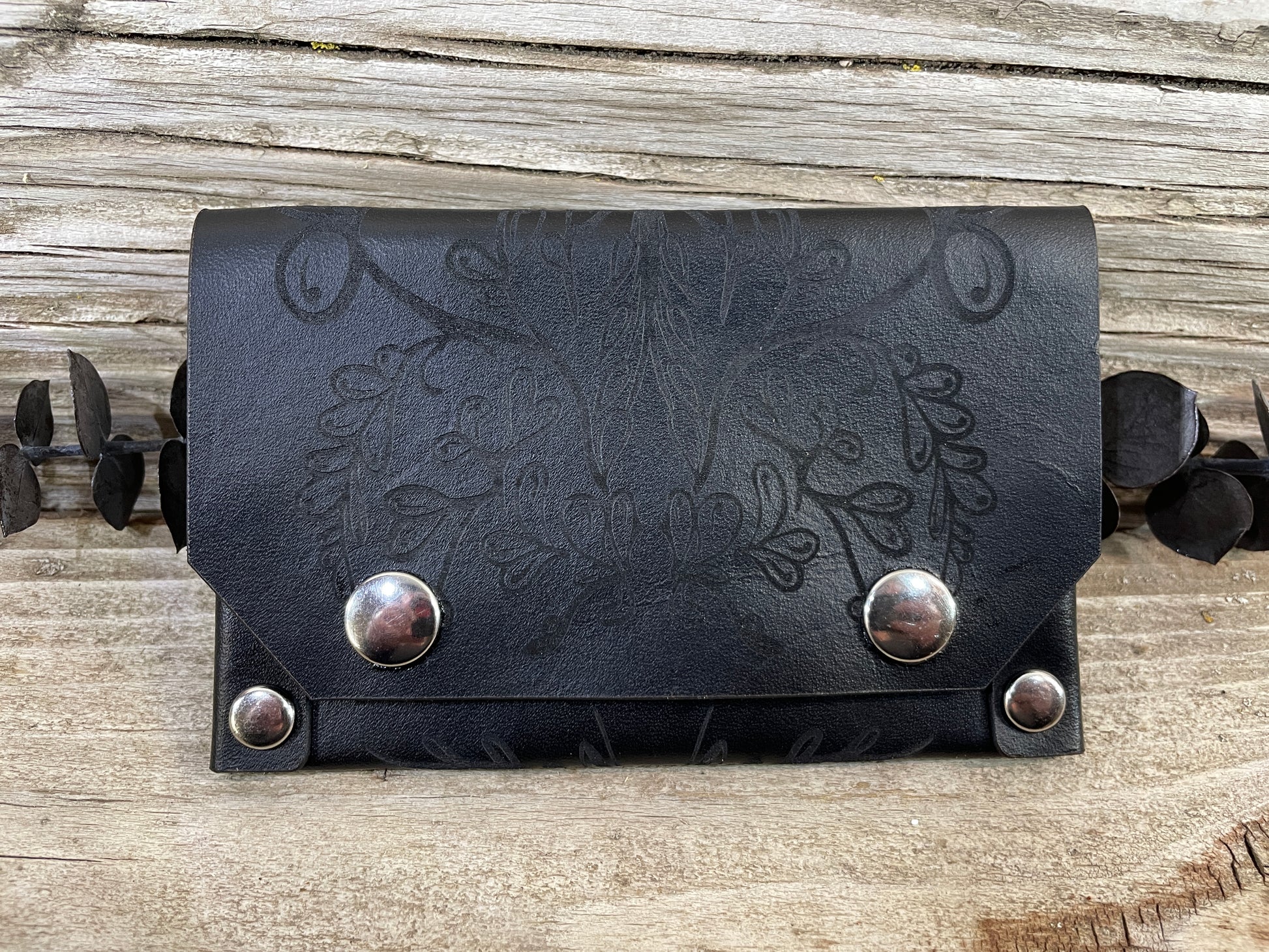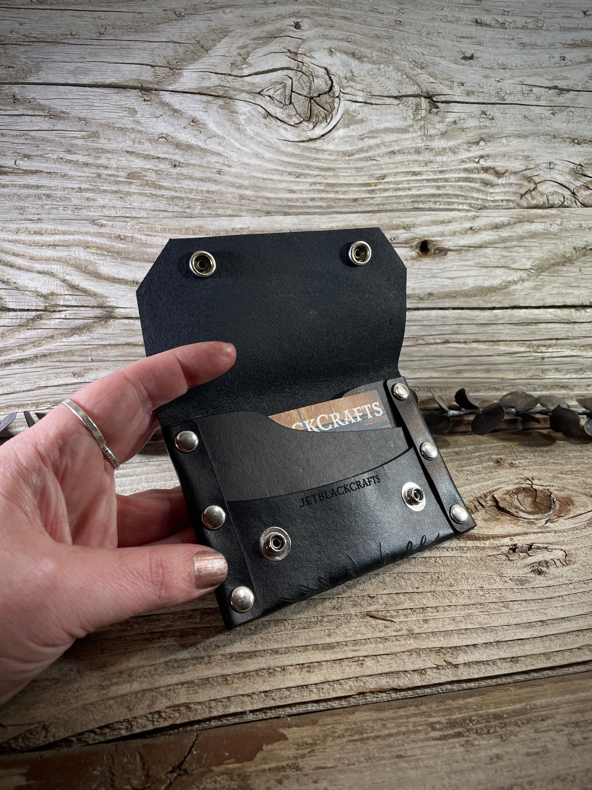 Small leather card wallet. It has three slots for credit/bank cards. The leather is hand dyed and stained. Each wallet is hand-crafted and will be unique.